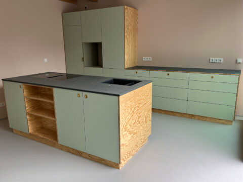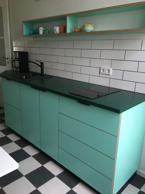 Küche im Sonderformat mit Sonderfarben. Italienischer Schichtstoff auf Birkensperrholz.