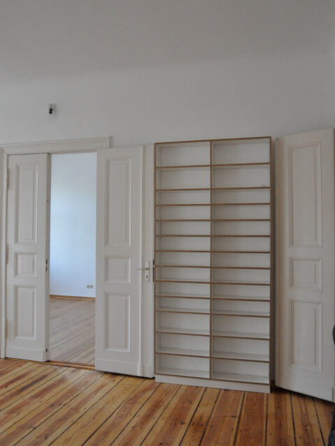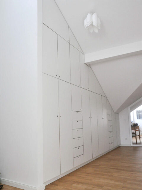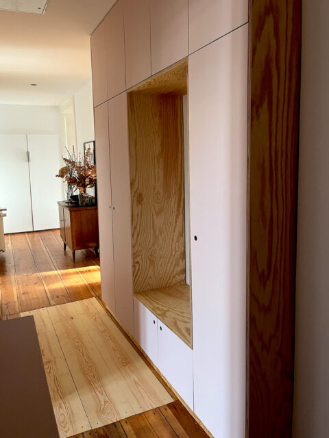 Dringend benötigter Stauraum für eine Familie in einer Altbauwohnung. Dekorspanplatte, selbstentworfene Ledergriffe. …