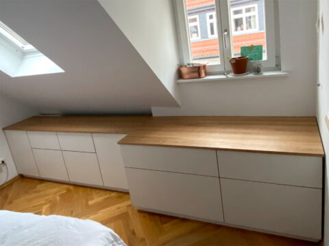 Bett mit viel Stauraum drumherum und auch darunter. Kleiderschrank, Regal und Geheimfach. Alles was die Dame von Welt braucht. Budgetfreundliche Dekorspanplatte und Eiche Vollholz für gute Träume. …