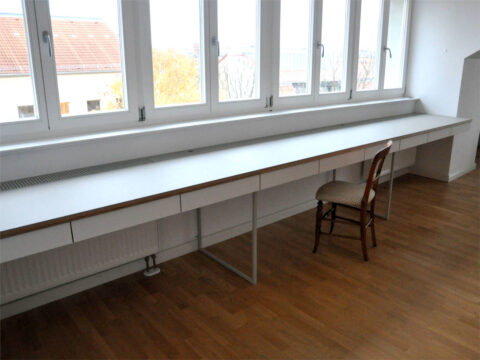 Arbeits- und Bastelplatz für eine 5-köpfige Familie. 5 Laufmeter Schubladen. Graues Linoleum, weißes Sperrholz und pulverbeschichtetes Blech. …