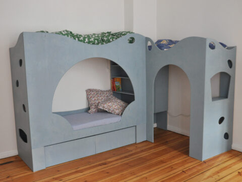 Schlaf- und Spielzentrale für 2 quirlige Kinder mit Tagesbett zum Träumen und Lesen, das auch für Omis Mittagsschlaf geeignet ist. Sperrholz, blau geölt. …