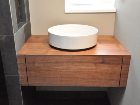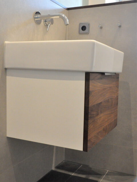 Schublade mit Stromanschluß, damit die Zahnbürste nicht nervt. Amerikanischer Nussbaum und weißes Sperrholz. …