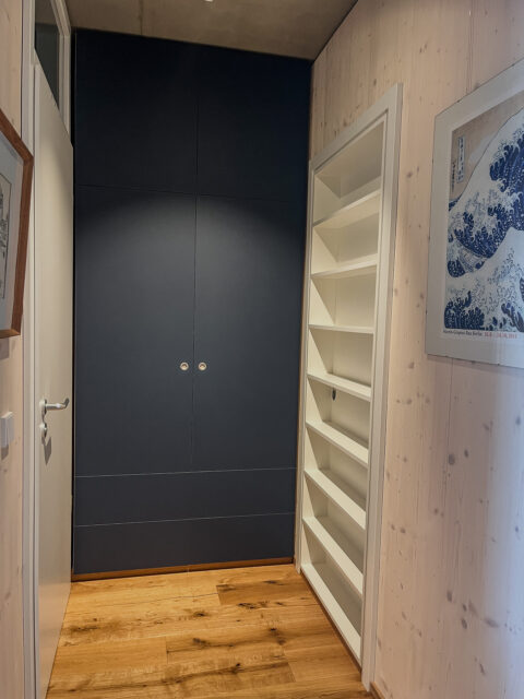 Relativ enge Nische. Es sollte Stauraum für Schuhe und den Staubsauger mit Ladestation entstehen. Fronten in blauem Linoleum. …