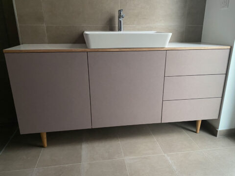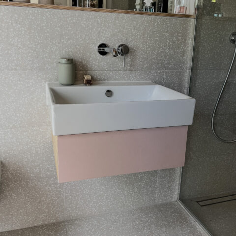 Minimalistischer Waschtisch mit Schublade aus rosa Linoleum und Seekiefer. …