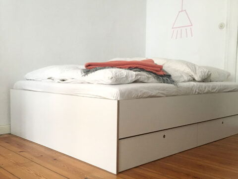 Weniger geht nicht. Fast unsichtbares Bett mit 2 großen Schubladen für Bettzeug etc. Sperrholz weiß, 18 mm …