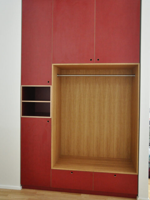 Empfangsgarderobe für ein Ingenieurbüro. Rotes Sperrholz und Eiche geölt. …