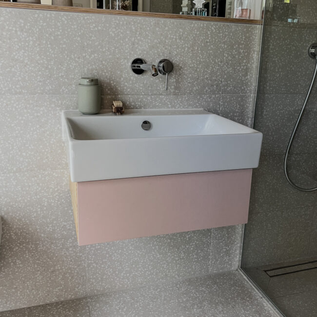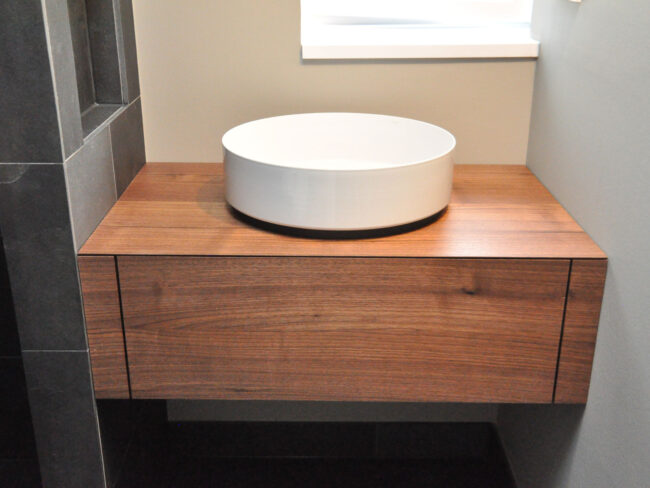 Einfach praktische Raumlösung für eine kniffelige Ecke. Spiegel mit Goldlicht als Spezialanfertigung. Geölte Eiche und Messing kombiniert mit wunderschönem Naturstein. …