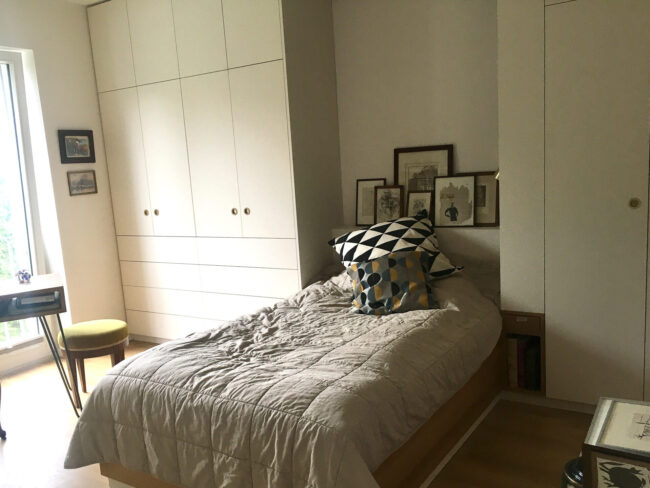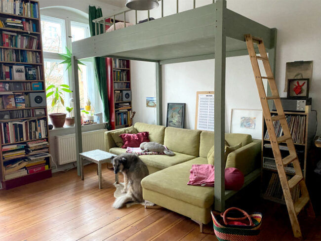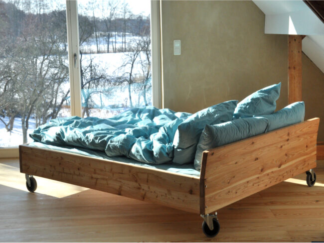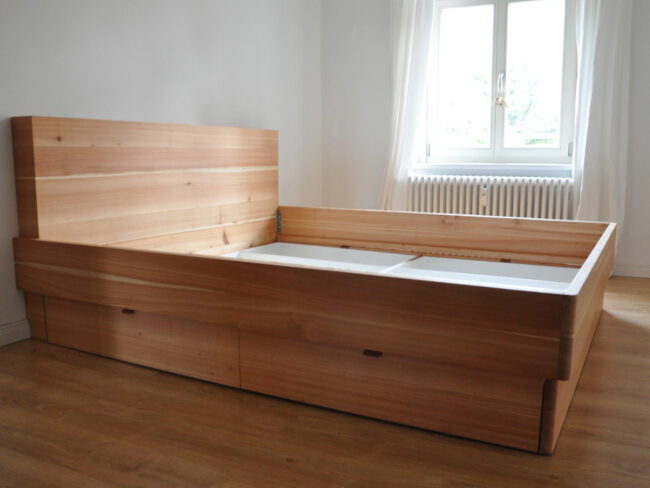 Bett mit viel Stauraum drumherum und auch darunter. Kleiderschrank, Regal und Geheimfach. Alles was die Dame von Welt braucht. Budgetfreundliche Dekorspanplatte und Eiche Vollholz für gute Träume. …