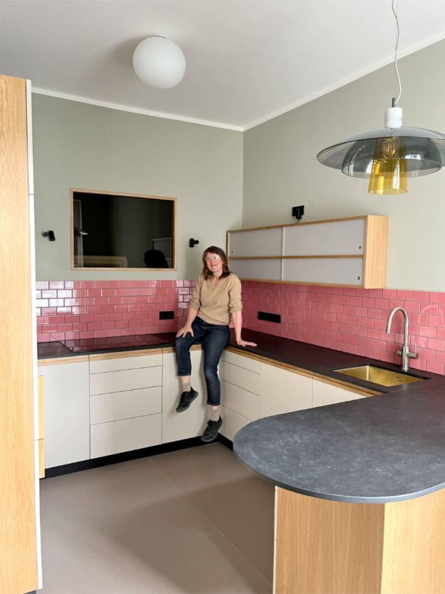 Dreiklang aus Eiche, Cremeton und schwarzem Schiefer. Beerenfarbene Fliesen aus Velten. Retrofliese.de …