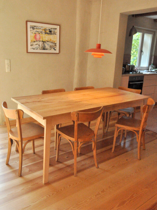 Großer Familientisch mit gerundeten Zargen und schrägen Füßen für mehr Beinfreiheit. Lokales, feinporiges Birnenholz. …