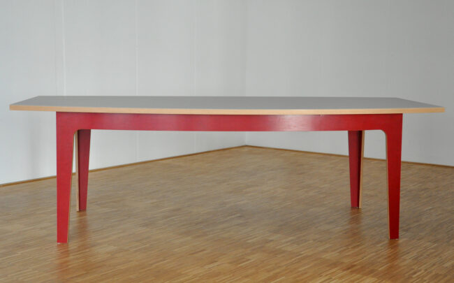 Konferenztisch. Gebogenes rotes Sperrholz, Eiche und graues Linoleum. …
