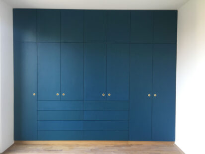 Im Schlafzimmer erstrahlt der blaue Nachhimmel mit ein paar Messingsternen.