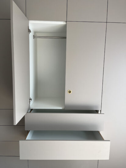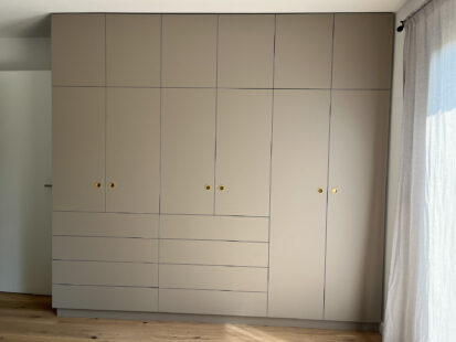 Kompakter Schlafzimmerschrank mit Fronten aus Dekorspan mit dekorativen Griffmuscheln aus Messing.
