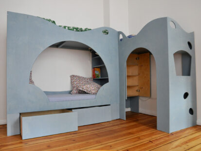 Schlaf- und Spielzentrale für 2 quirlige Kinder mit Tagesbett zum Träumen und Lesen, das auch für Omis Mittagsschlaf geeignet ist.