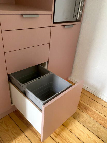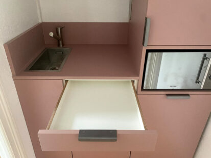 Teeküche auf 1,2 m verdichtet: Spülmaschine, Kühlschrank, Spülbecken, Mikrowelle, Müllsammler, Licht, Stauraum….alles da.